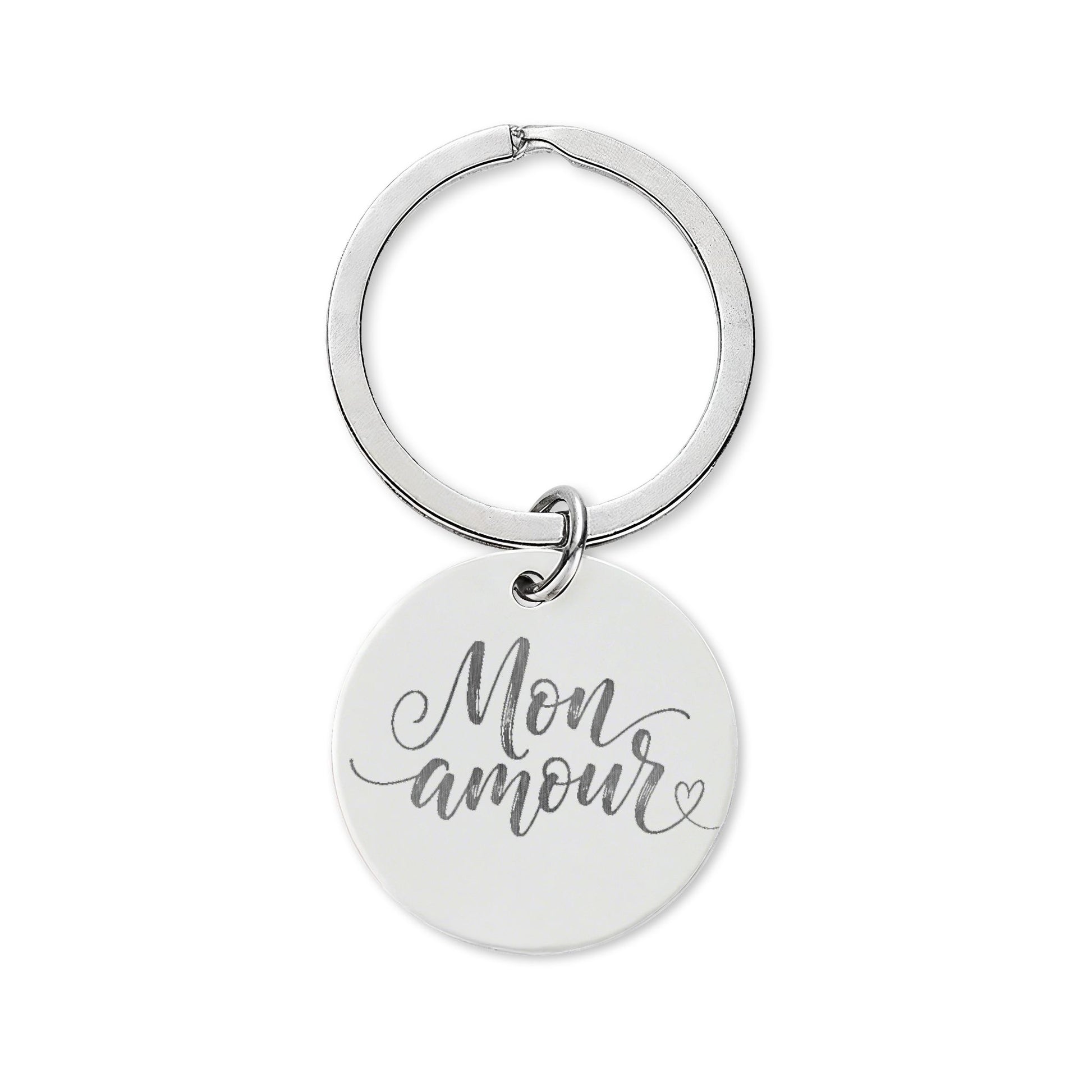 Engraved Stainless Steel Keychain — "Mon Amour" Round Charm (Romantic Gift)