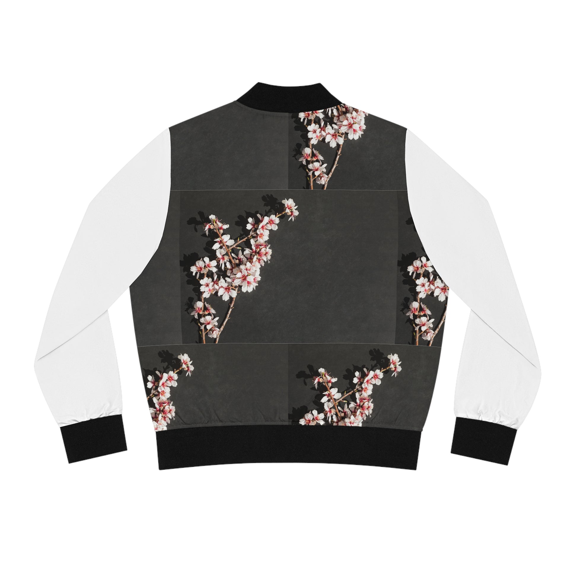 Light, bright, and quietly bold — this bomber jacket feels like a spring morning you can wear. The top panel blooms with tulips and sunshine, while the back’s muted cherry blossoms sit against charcoal blocks for contrast. Soft black ribbing and a copper zipper give it a polished edge. Slip it on for walks through neighborhoods waking up to flowers, weekend coffee runs, or gallery visits where you want a touch of color without shouting. It sits comfortably over dresses or jeans and becomes the piece people comment on: floral but grown-up, cheerful but composed.