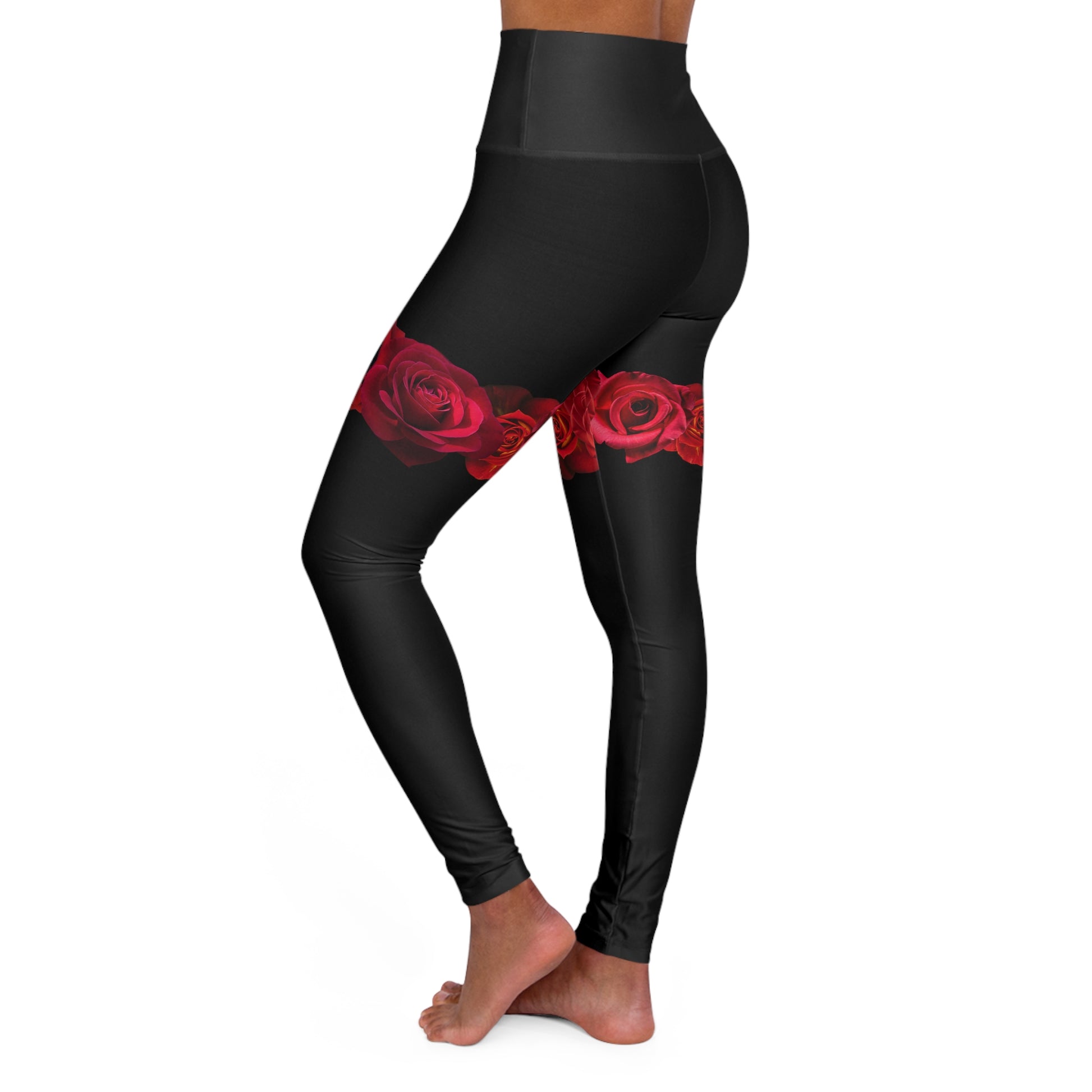 These high-waisted leggings bring quiet confidence to movement and everyday life. Smooth black fabric creates a slimming canvas while a band of painterly red roses wraps around the upper thighs, like a private bloom you catch in the mirror when you tie your hair back. The double-layer waistband hugs the midriff without digging in, and the four-way stretch follows every lunge, fold, and walk with steady support. Wear them for a slow morning flow, a city coffee run, or an evening of stretching on the couch — they hold shape, move with you, and add a touch of floral edge when you want to feel grounded and a little bold.
