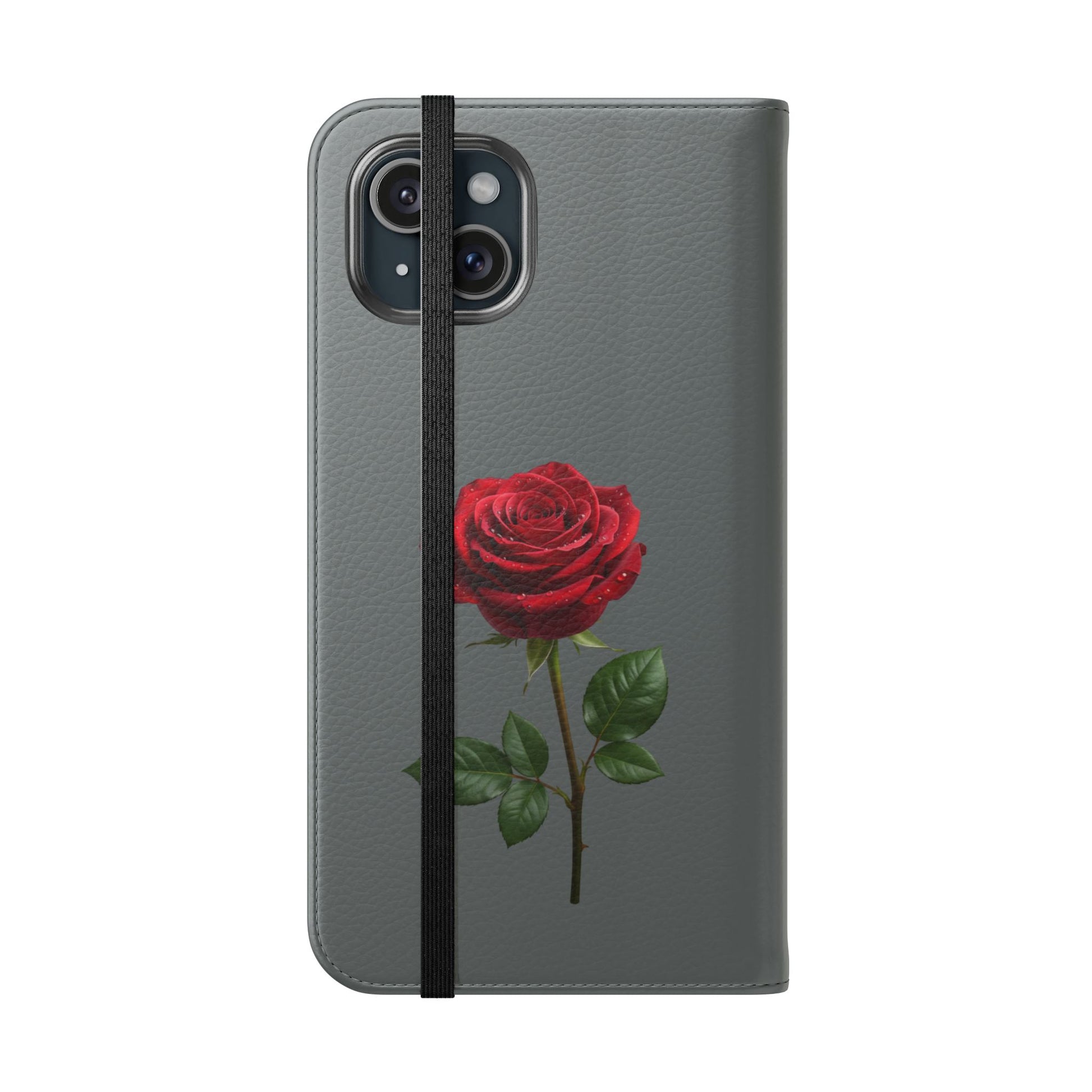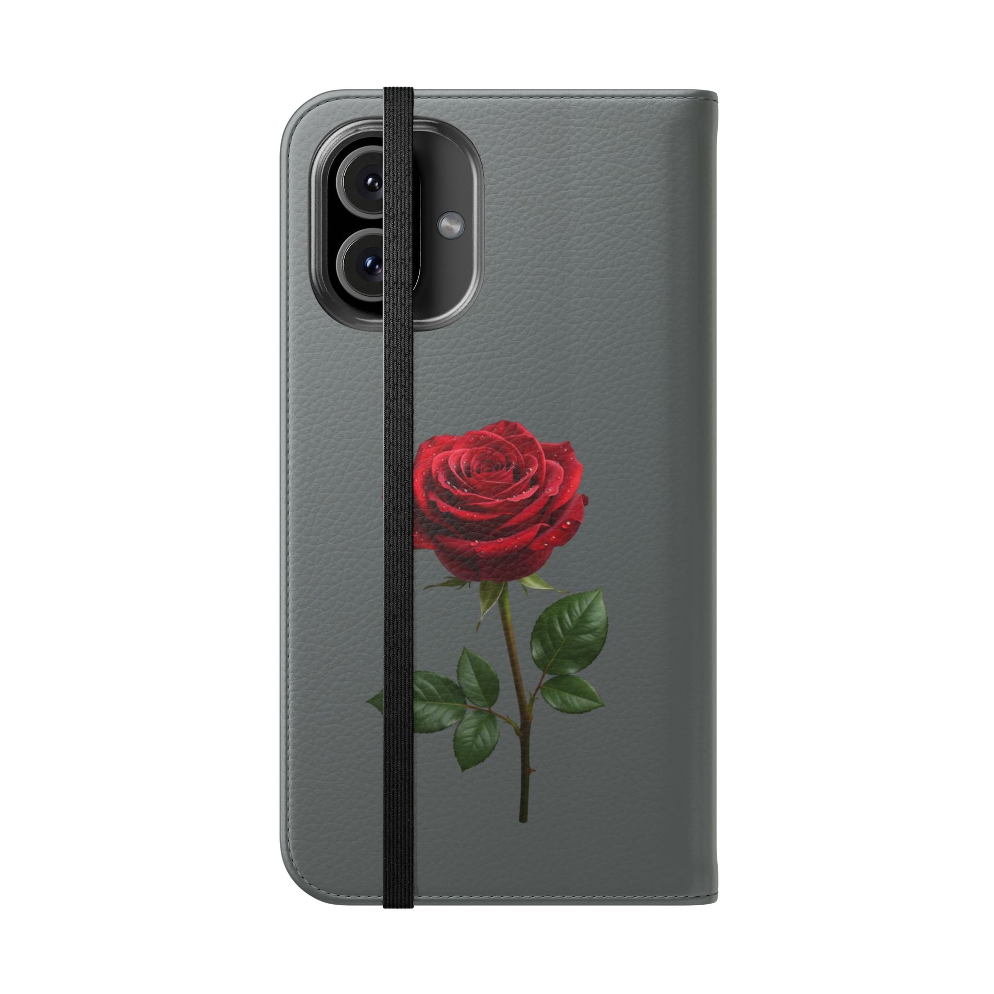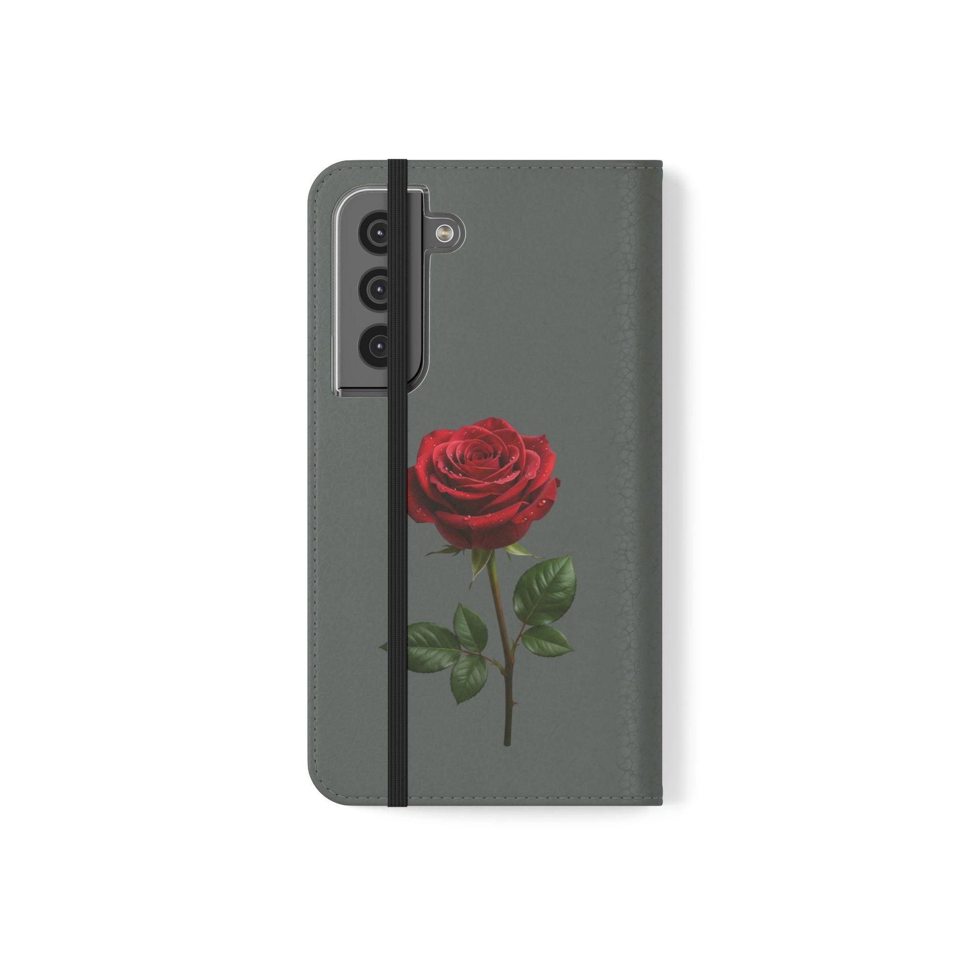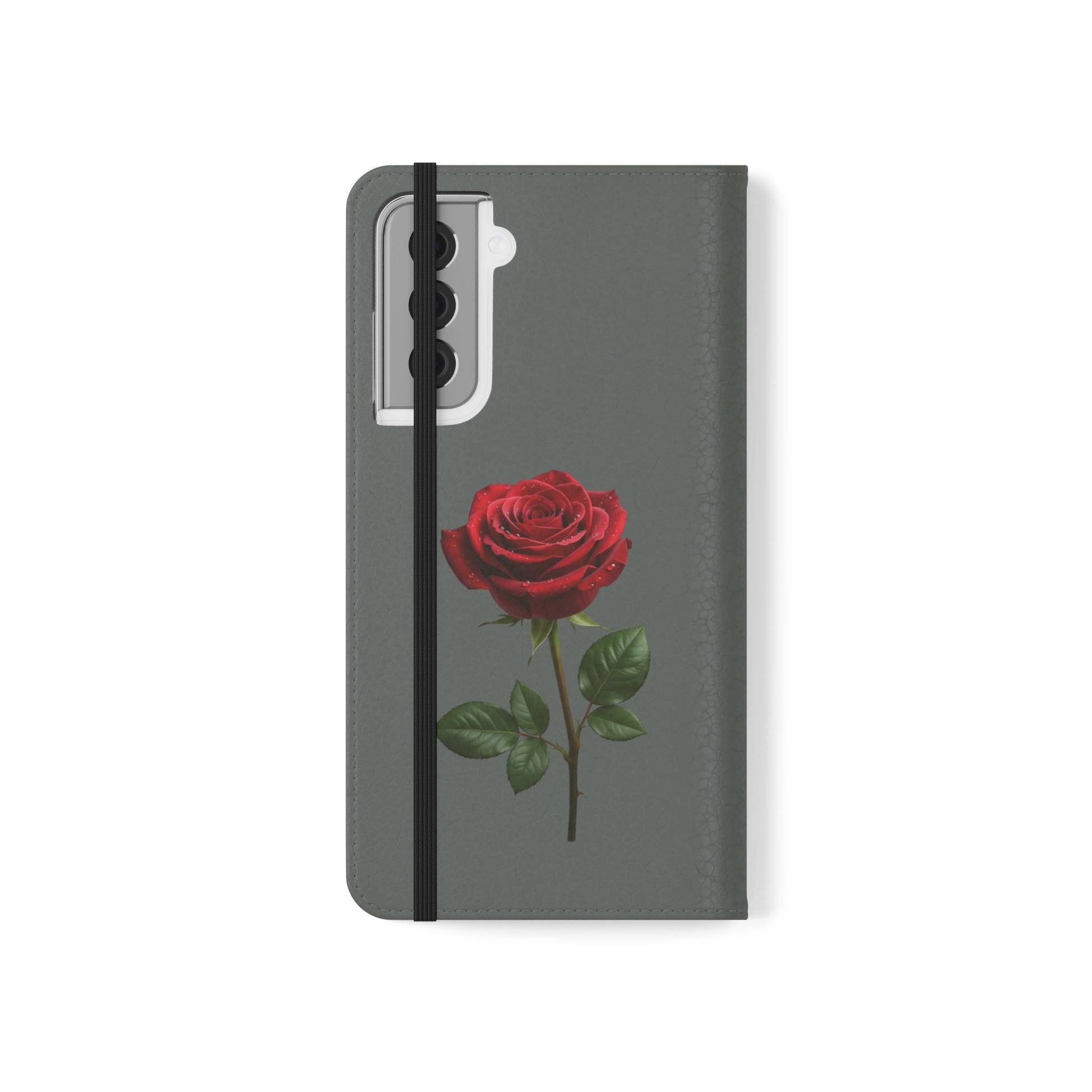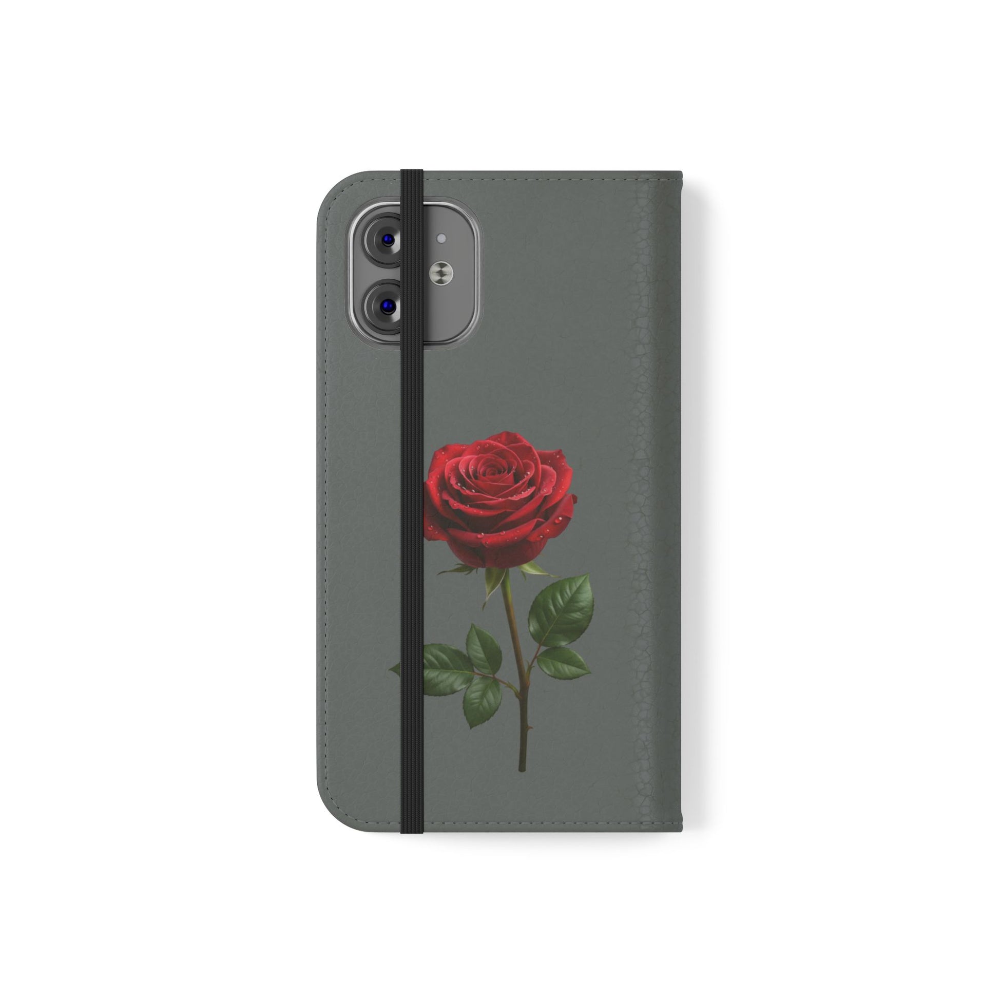 A soft faux-leather flip phone case that brings a touch of romance to your daily routine. The muted gray cover is printed with two richly detailed red roses and the handwritten phrase “Mon amour,” creating a quiet, elegant look that pairs well with both casual and dressy styles. Inside, a durable polycarbonate shell snaps your phone securely into place while stitched card pockets keep a transit card and a few essentials within reach. A built-in stand folds to prop the phone for watching videos, and clear port openings keep charging and audio simple. Thoughtfully made in South Korea with cruelty-free materials and a flat elastic fastening, this case balances protection, convenience, and a little sentimental charm for everyday use and travel.
