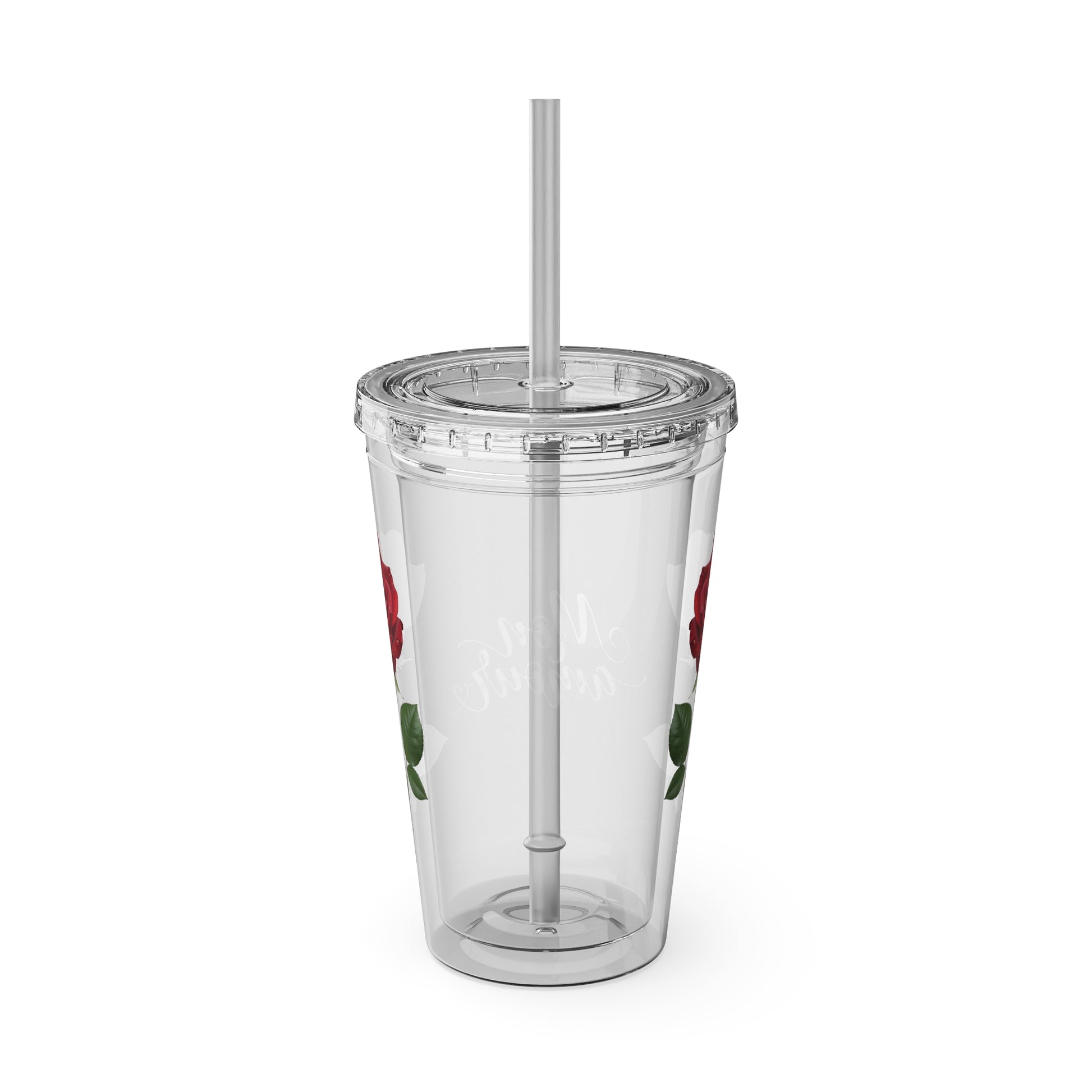 Rose-Print 16oz Tumbler with Straw — "Mon Amour" Clear Cup for Mom, Valentine's Gift