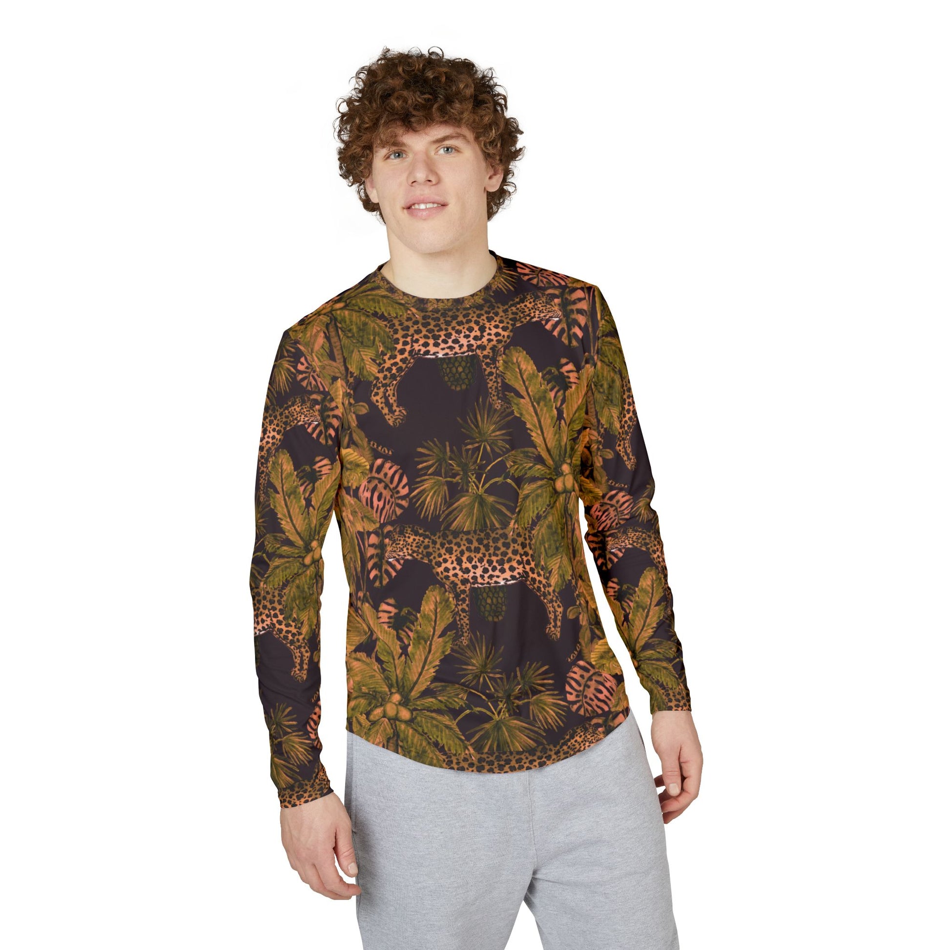 Roam into warm, dappled shade with this long sleeve that feels like a slow afternoon in the jungle. Lightweight, stretchy fabric hugs your movements while a rich, hand-painted pattern of leopards and tropical leaves wraps the shirt in earthy greens, rusts, and deep shadow. Wear it on sunny hikes or river-side afternoons — the built-in UV protection keeps shoulders safe while the breathable knit keeps you cool. The tailored hem and reinforced shoulder tape mean this piece moves with you and keeps its shape season after season. It’s for people who chase light through leaves and want clothing that blends function with a textured, nature-first aesthetic.