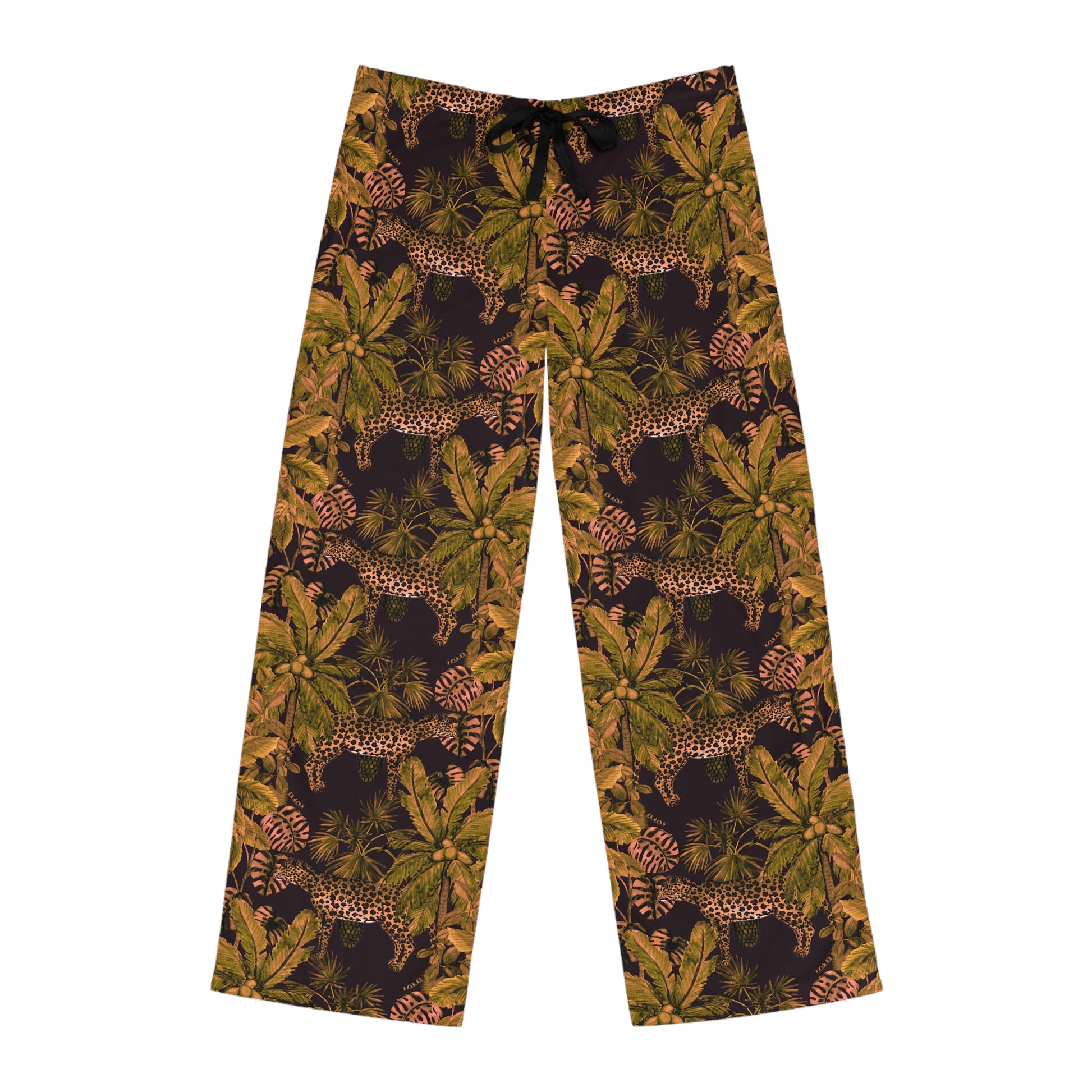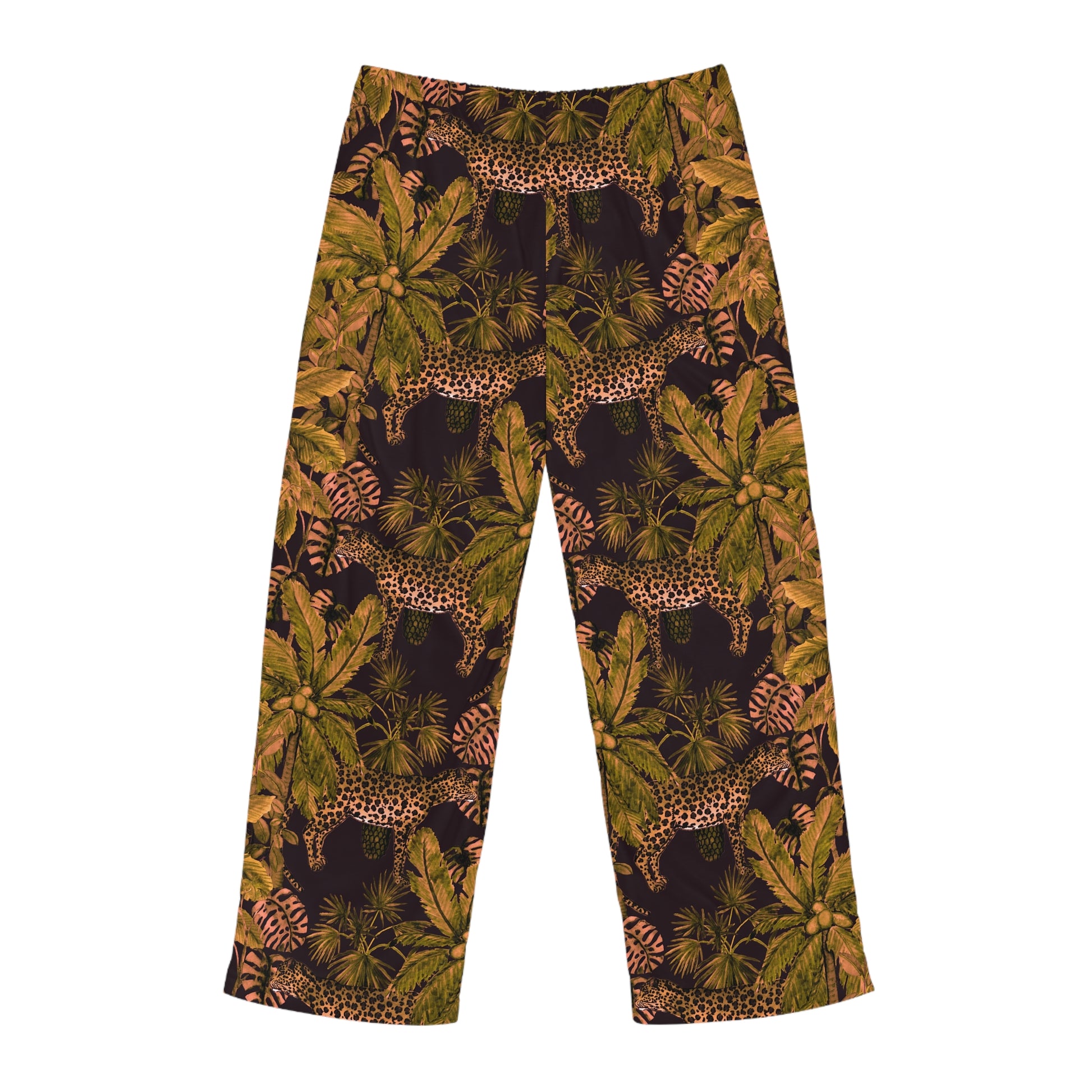 These lightweight pajama pants bring a quiet, wild energy to slow mornings and late-night lounging. The all-over print layers lush jungle foliage with prowling leopards in warm, earthy tones — a grown-up, adventurous pattern that reads like a cozy escape. Cut for a relaxed fit with a soft polyester jersey face, they move easily through breakfast, reading by a window, or stretching into bedtime. The elastic back and flat black drawstring let you tune the fit without fuss. Stitching is reinforced and seams are clean, so these pajama pants hold their shape while staying breezy and light.
